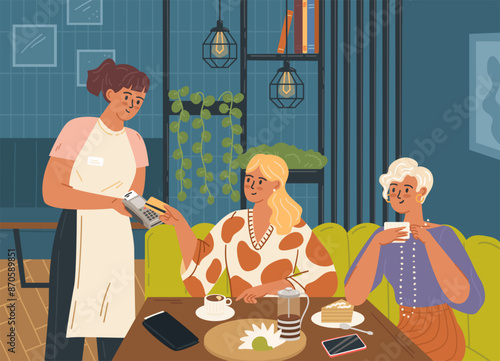 Woman friends cartoon characters paying for lunch in restaurant using credit card, cashless pos terminal and wireless payment vector illustration