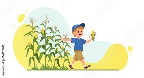 Young woman farmer, agricultural worker female character gathering corn harvest in bowl isolated on white background. Farm life and harvesting vector illustration