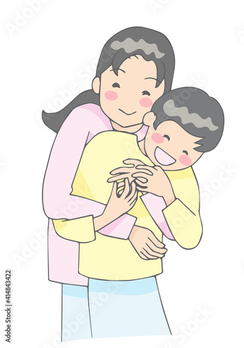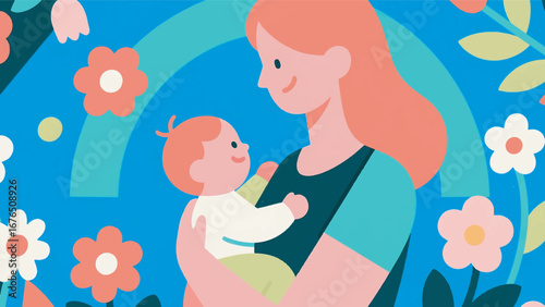 Woman holding a child vector illustration in retro pop art style. Mother with her kid comic design poster.