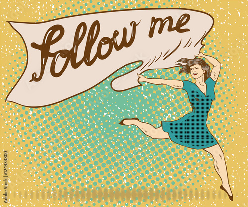 Woman holds banner with follow me sign. Pop art comic retro style vector illustration.