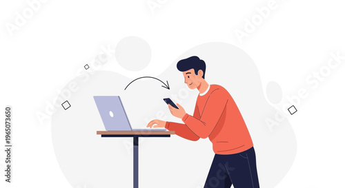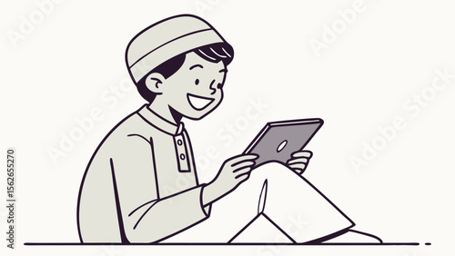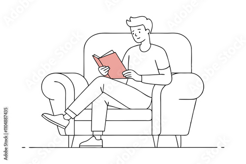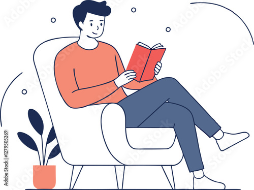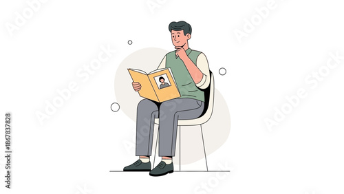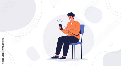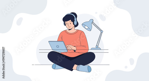 Man in headphones listening to audio programs on tablet computer, flat vector illustration. Male character listening to music, radio, podcast, audiobook. Podcasting, online radio, streaming.