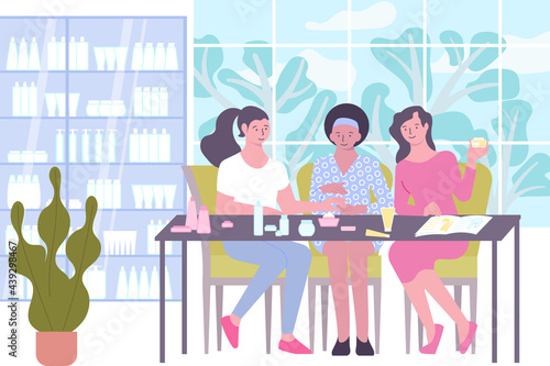 Woman in nail beauty salon receiving manicure by master with nail file. Customer in manicure studio concept vector illustration. Body care spa, beauty treatment, fingernail service.