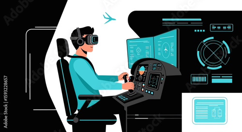 Woman in wheelchair works with virtual reality screens. Female engineer and data analytic. Diversity and Break the science bias concept vector illustration. Women in tech. Innovative technologies.