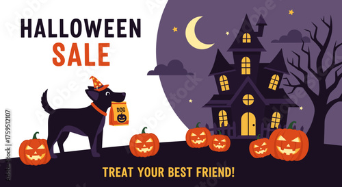 Woman in witch halloween costume going to night club. Halloween party celebration. Vector illustration. Pumpkin decoration.