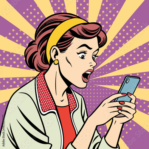 Woman looks at the mirror vector illustration in retro comic pop art style. Speech bubble.
