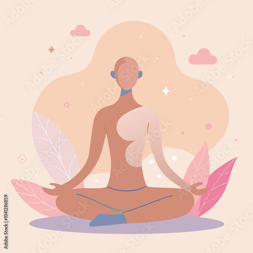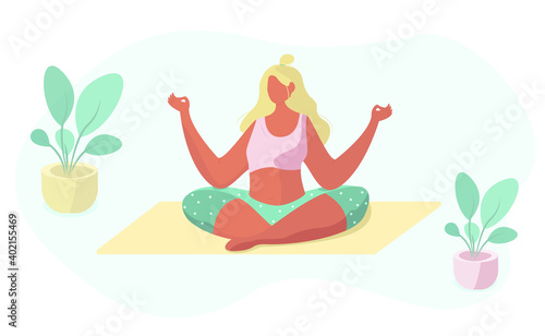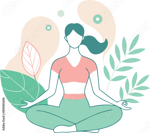 Young woman meditating on nature vector illustration. Cartoon girl doing stress relief exercise, calming mind, breathing for harmony. Concept of yoga, meditation, relax, recreation, healthy lifestyle