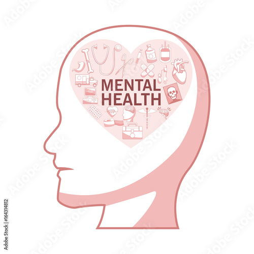 Woman head silhouette with flowers and butterflies, vector illustration in paper art style. Psychology, female mind, mental health concept.