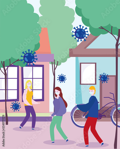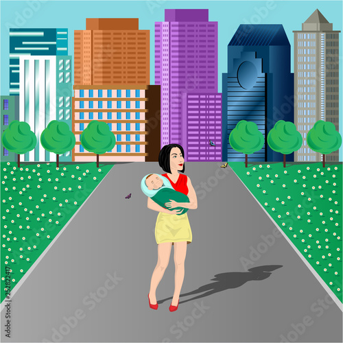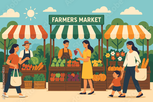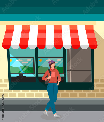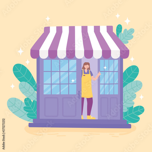 Woman pet owner with puppy visiting bakery or pastry shop scene. Dog-friendly environment vector illustration