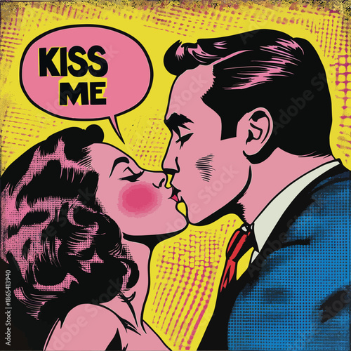 Woman present gift to man. Heart shape speech bubble. Vector illustration in retro comic pop art style. Beautiful girl with christmas or birthday gift.