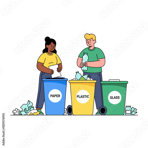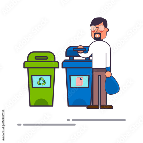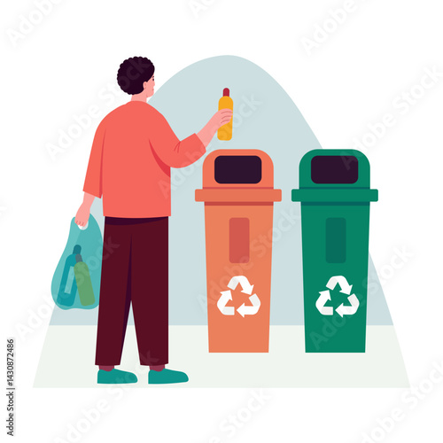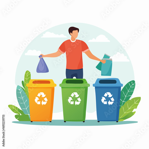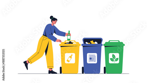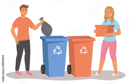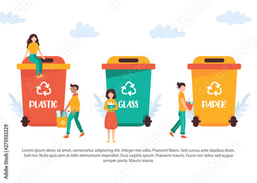 Woman put garbage bag into trash bin. Waste sorting and recycle concept illustration. Vector web site design template. Different colors containers for different types of waste. Plastic, metal, paper.