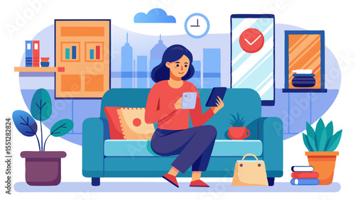 Woman reading book on sofa while vacuum cleaner domestic robot clean a room. Robotics technology concept vector illustration.