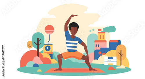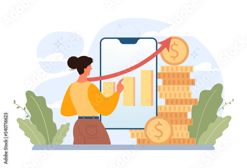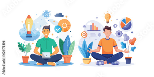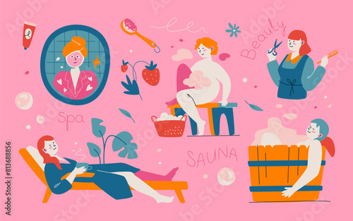 Young woman reading book while sitting, standing, lying at home and outside. Vector illustration in flat style.