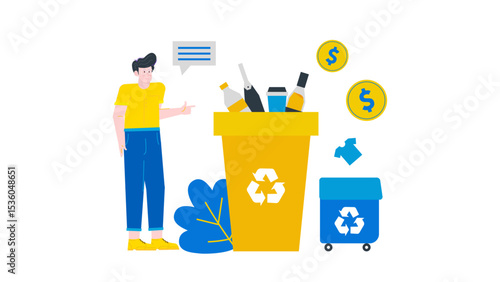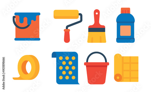 Woman repair room and putting new wallpapers at home. House renovation concept illustration. Vector web site design template. Wallpaper roll, paintbrush, bucket of glue.