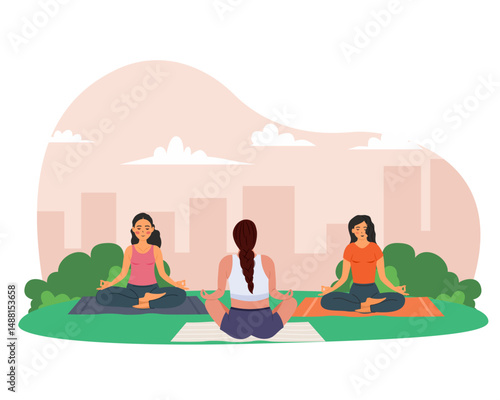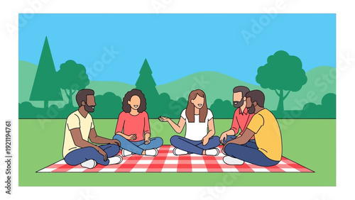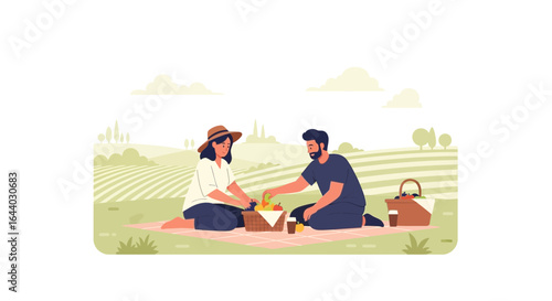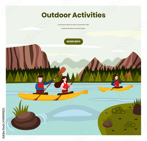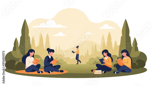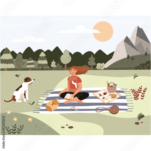 Woman siting on a blanket and reading book with mountain landscape on background. Summer outdoor picnic concept illustration. Vector web site design template. Weekend and vacation, outdoor travel.