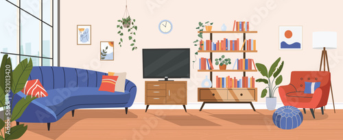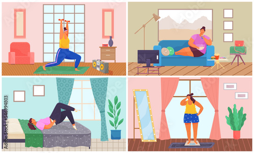 Woman sitting on a floor with laptop in cozy interior. Home office concept illustration. Vector web site design template. Girl working at home.