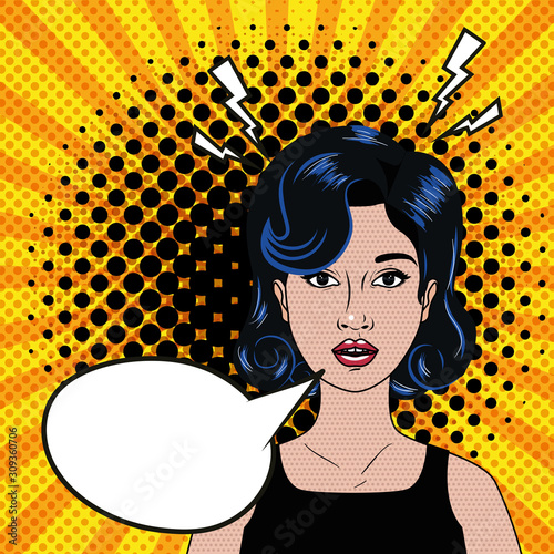 Woman smiles and shows OK hand sign with speech bubble. Vector illustration in retro comic pop art style. Fitness girl in good shape with bottle of water.