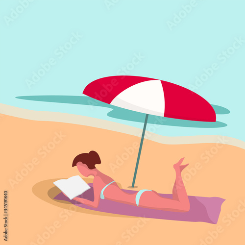 Young woman sunbathing on beach applying sunscreen flat cartoon vector illustration. Girl caring for skin while resting at resort seaside. Beauty and health concept