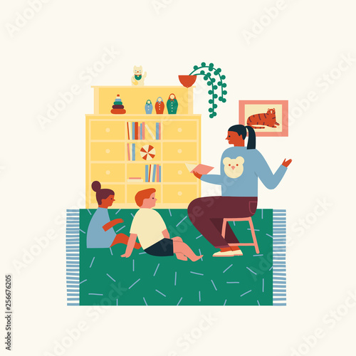 Woman teach her son abc. Home school concept illustration. Vector web site design template. Mother play with kid at home.