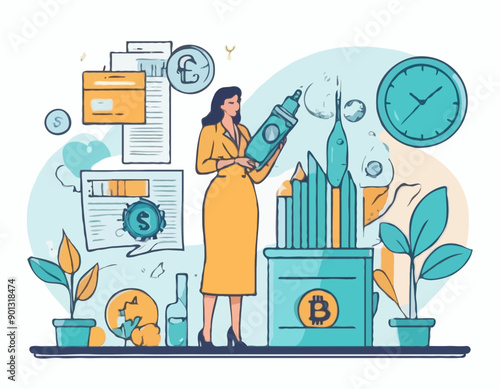 Woman traveler character with suitcase bag choosing relocation destination. Immigration scene vector illustration. Planet with geolocation pins, money cash, place of destination and new home