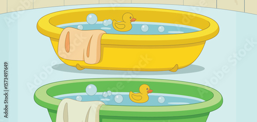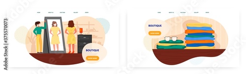 Woman tries on new dress in fashion store and look in mirror. Customer and seller wear face mask to protect from coronavirus. Concept illustration. Vector web template. Stack of clothes, fashion shop.