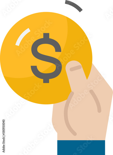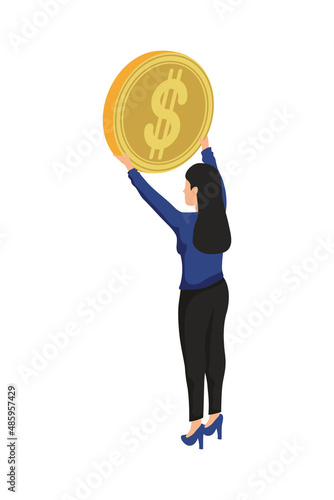 Woman volunteer donating money vector. Charity and donation icon. Female character carrying gold dollar coin isolated on white background