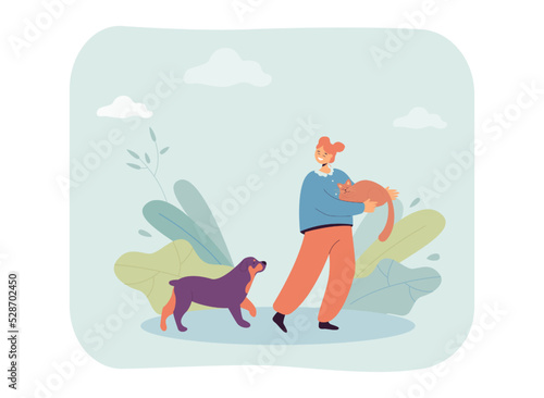 Woman walk on a tightrope. Cave explorer speleologist. Extreme sport and speleology vector concept illustration. Rope walker keep balance. Web site design template.