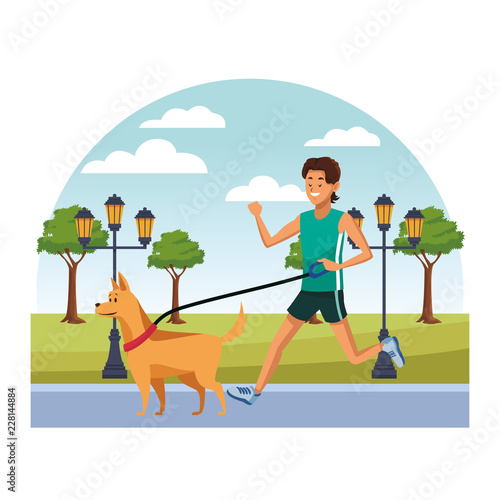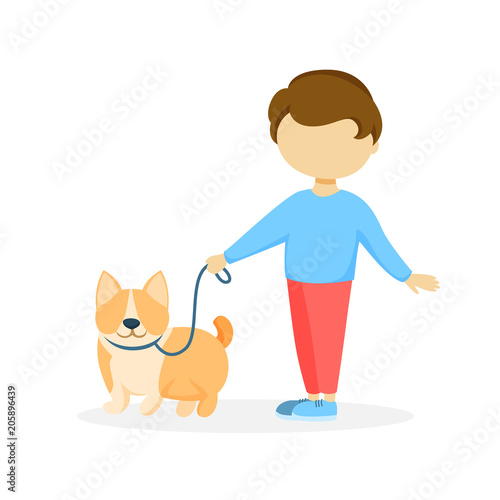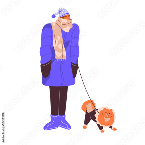 Woman walking dog and picking up pet waste vector illustration. Female character throwing canine poop in special bag into trash can isolated on white background