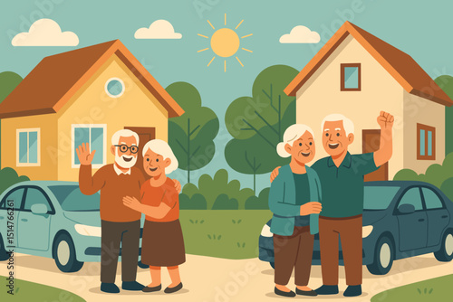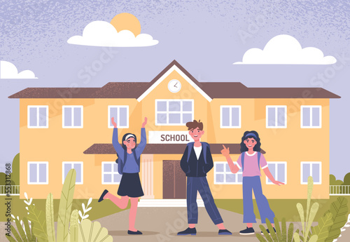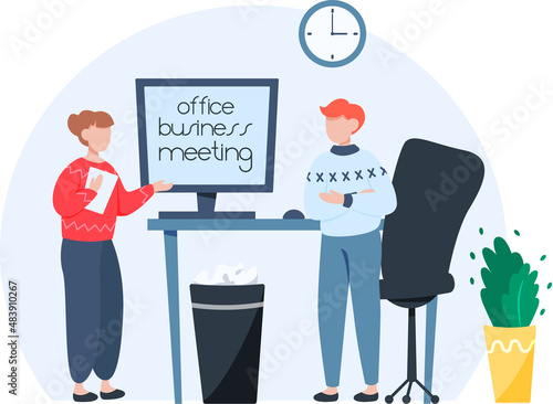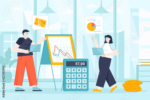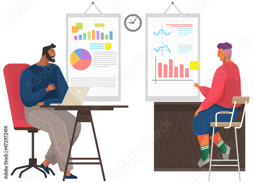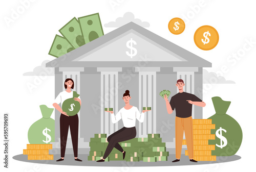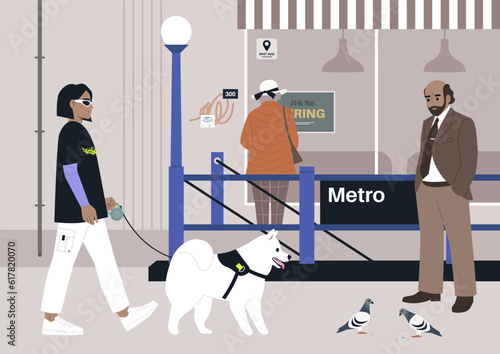 Woman with a dog walks by cafe with glass door. People drink coffee in restaurant, concept vector illustration. Cafe owner greets customers in front of his shop.
