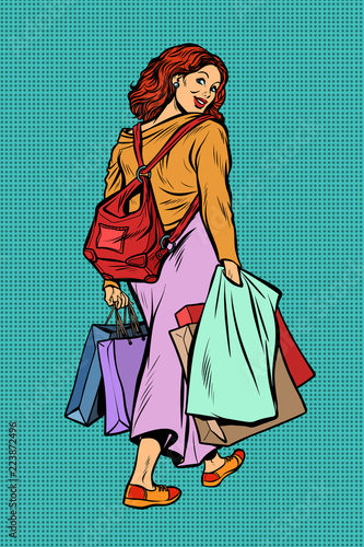 Woman with bags shopping. Vector illustration in comics pop art style. Special sale offers advertising poster.