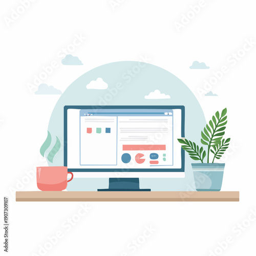 Woman with laptop sitting on windowsill and working from home. Laptop on a desk with graphic design software. Digital design concept illustration. Vector web site design template.
