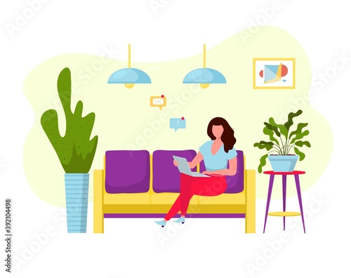 Woman with laptop works from her couch at home. Office computer on a desk. Concept illustration. Vector web site design template. Computer screen with ux design software.