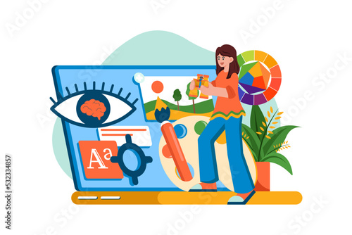 Woman with sport knee prosthesis plays basketball. Disability concept illustration. Vector web site design template. Disabled girl on wheelchair painting landscape at home.