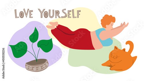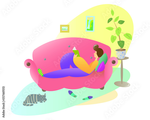 Woman working on laptop at home office vector illustration. Young girl lying on sofa couch chatting friends in social media, studying online or engaged in distance work