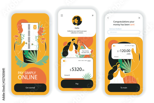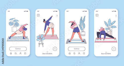 Women acrobatic gymnastics, high diving sport competition, training. Winner trophies. Mobile app screens. Vector banner template for website and mobile development. Web site and UI design illustration
