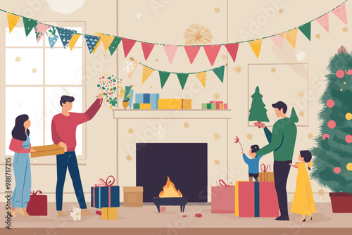 Atelier scene with dressmakers, fashion designers and customers, flat vector illustration. Female characters choosing fabric, trying on dress. Sewing workshop, studio interior. Tailoring business.