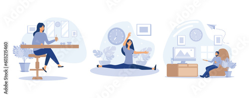 Fitness people cartoon character set, flat vector illustration. Girls doing kangoo, pilates, stretching, tae bo fitness exercises, riding stationary bike. Gym workout. Active and healthy lifestyle.