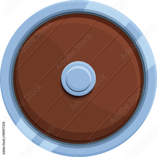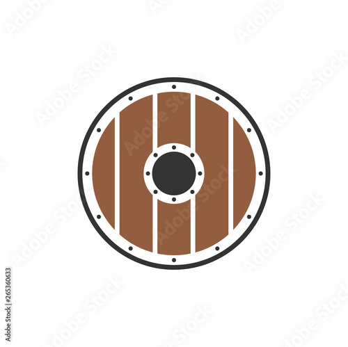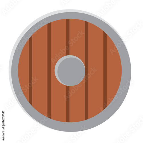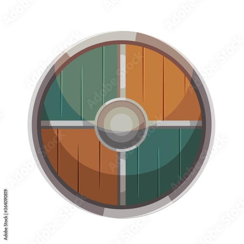 Wooden shield vector. Round viking armor with steel frame and rivet isolated on white background. Celtic barbarian or medieval timelier military protective board
