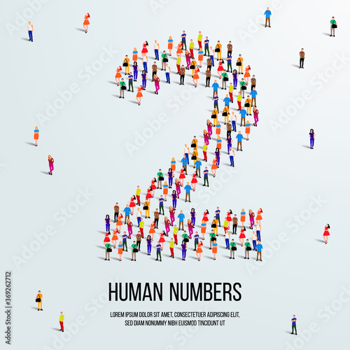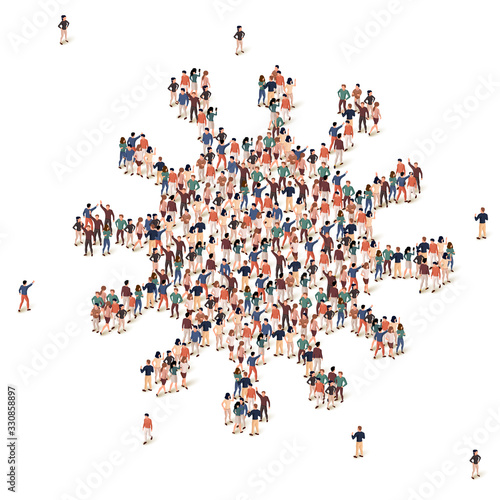 Word Yes made of many people, large crowd shape. Group of people stay in Yes sign formation. Social activity, collective action and public engagement. Vector illustration in isometric style.