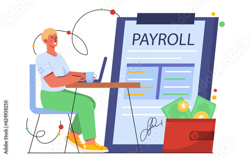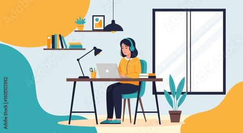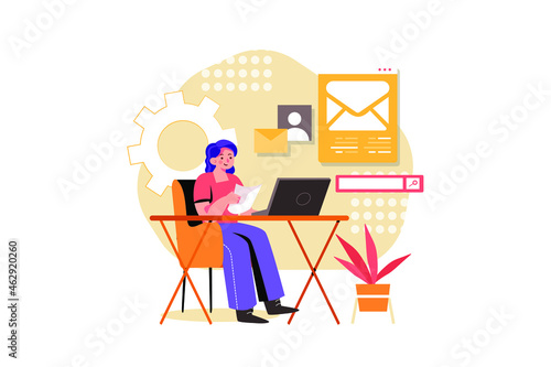 Tiny female characters working from home using laptop computer and internet connection, vector flat illustration. Remote work, freelance, home office.