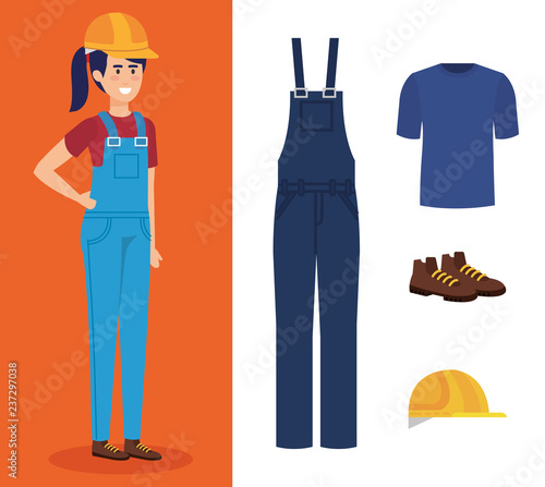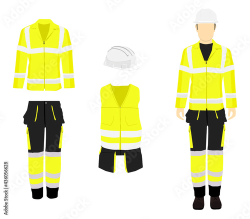 Professional work wear and uniform set, vector isolated illustration. Realistic protective coverall with reflective stripes, t-shirt, boots, safety goggles and yellow helmet.