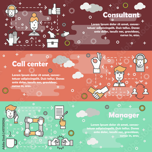 Vector set of horizontal banners with Consultant, Call center and Manager line art flat style design elements, web templates.