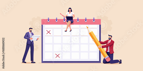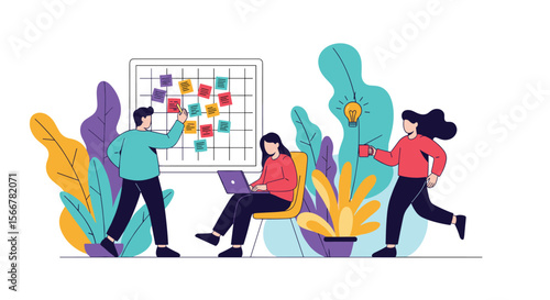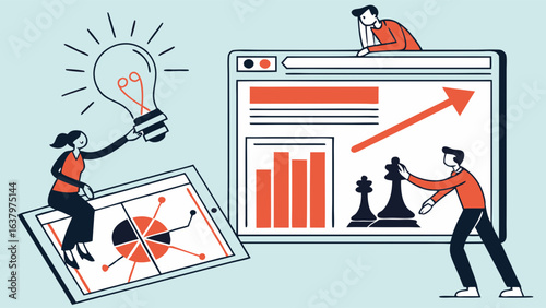 Vector illustration of big laptop and tiny people monitoring statistical dashboard, holding light bulb, shouting through megaphone. Business workflow process concept for web banner, website page etc.