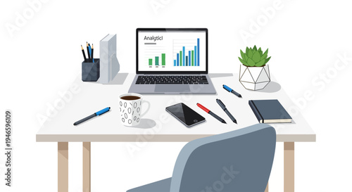 Workplace on summer tropical beach vector poster template. Laptop computer, pina colada cocktail, camera, sunglasses on table under beach umbrella. Freelance, remote working place, flat style design.