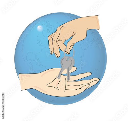 World organ donation day vector poster. Human hand offering heart to spreading arms over earth map flat design. Transplantation and surgery concept. Saving lives and health care Illustration