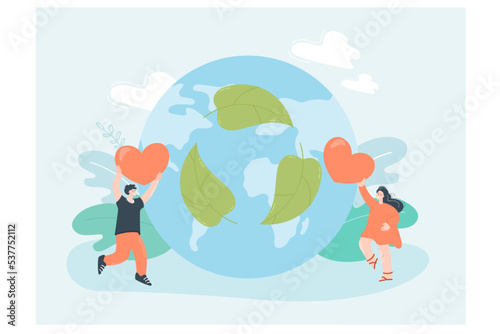 Planet Earth globe with multiracial handshake, tiny characters with heart, sprout, flat vector illustration. International Peace Day, stop racism, world peace, global partnership, planet care.