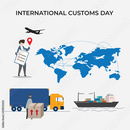 Worldwide delivery concept vector flat illustration. Computer with world map and location pin on monitor, drone delivering parcel, globe, truck. Shipping, tracking, delivery services poster, banner.