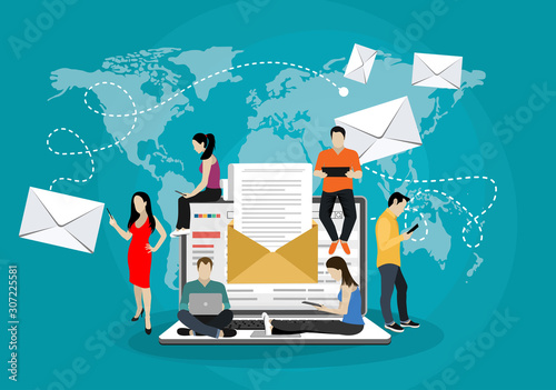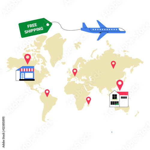 Worldwide delivery concept vector flat illustration. Computer with world map and location pin on monitor, drone delivering parcel, truck, globe, handshake. Delivery service poster, banner.