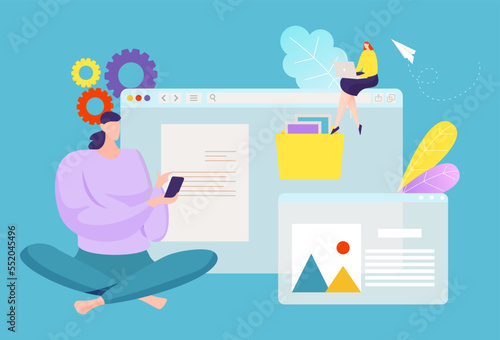 Writing landing page design, website banner template set, flat vector illustration. Student studying, doing writing exercise with quill and ink. Writer, journalist working sitting at desk.