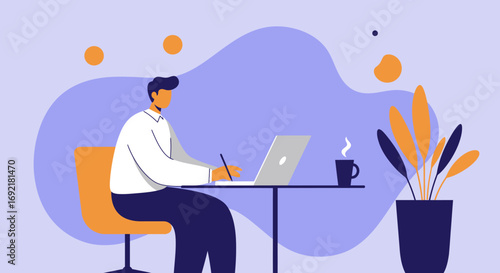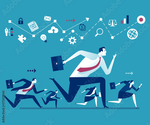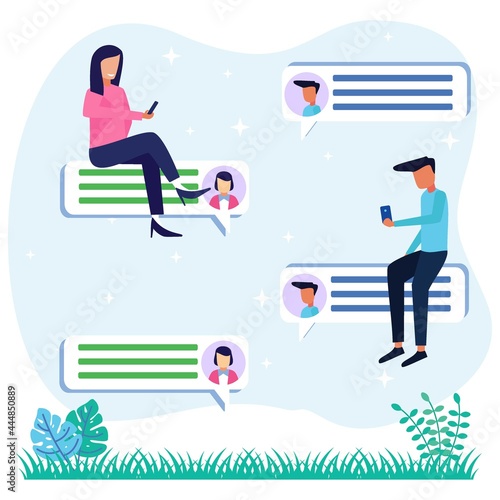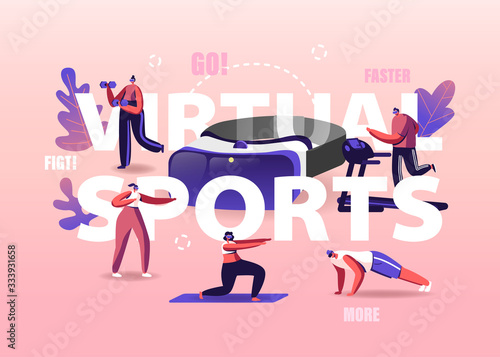 Business people man and woman doing warrior 1 office yoga poses at work together with online coach, vector flat style design illustration. Online coaching, yoga and meditation in office concept.