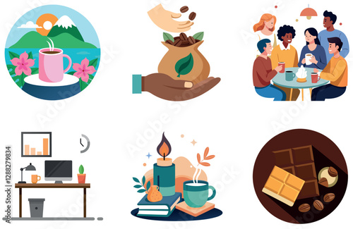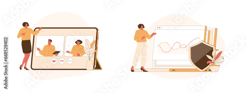 Young and senior women sitting on their beds with laptop computers, flat vector illustration. Bedroom interior, female characters working remotely from home, chatting, surfing the net, studying online